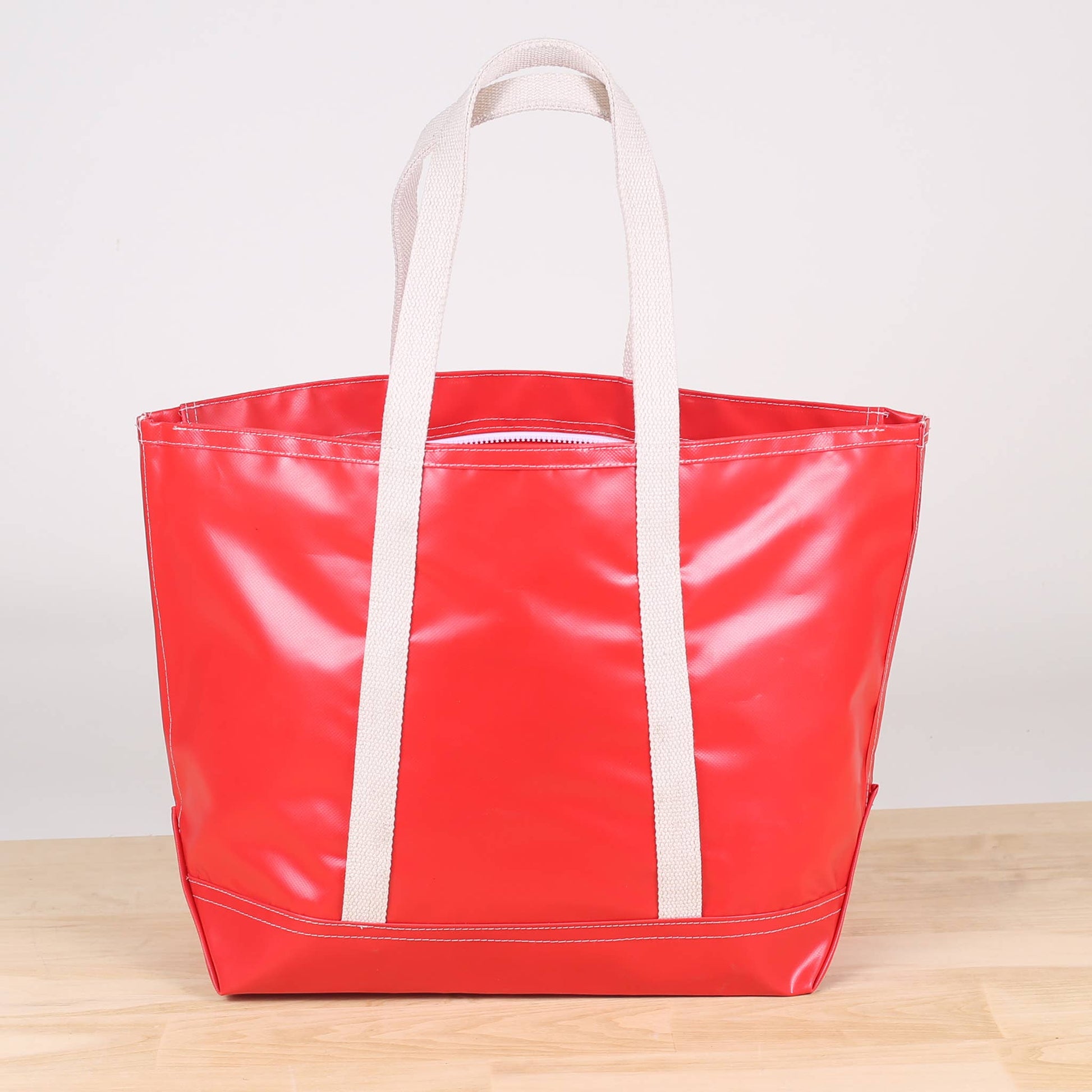 Made for sun, sand, shade, surf, and shore, these tote bags are your new outdoor go-to. The water resistant fabric allows water to roll off and not be absorbed. Thick cotton handles to slip over your shoulder. Plastic chunky zippers that won't rust Two holes in the bottom allow sand and any excess water to shake out Interior hanging pocket Size: 22” wide x 14” high x 8” bottom gusset.