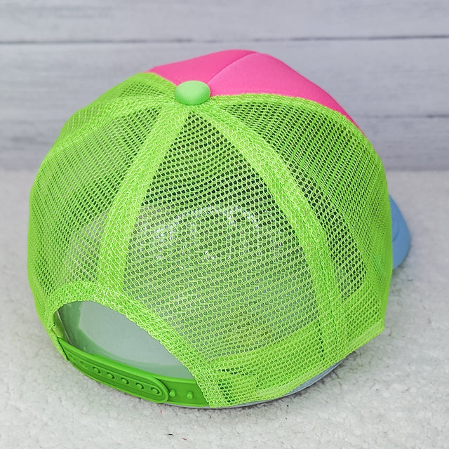 Super unique and custom made for Trendy! These tricolor caps are a great addition to any summer look! Blue bill, neon pink front, and neon green mesh backing.