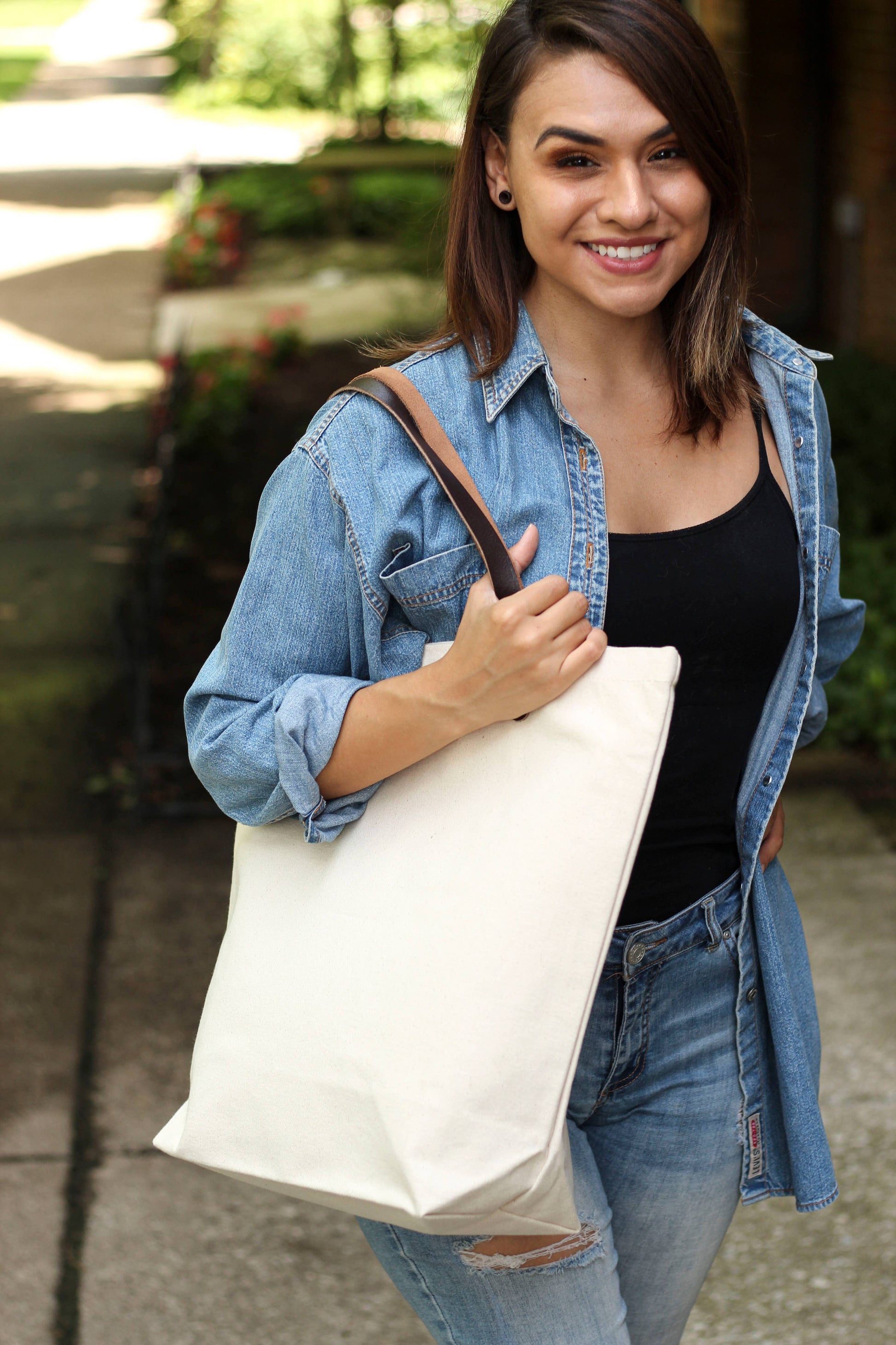 We used color-saturated canvas to create an urban profile that is narrower and longer than most of our bags. Thin, chestnut-colored handles that slip over your shoulder, this rich bag has a stylish collegiate look. Crafted from eco-friendly, heavyweight cotton canvas 16” supple leather handles secured with brass metal studs Interior hanging pocket Open top for easy accessibility.