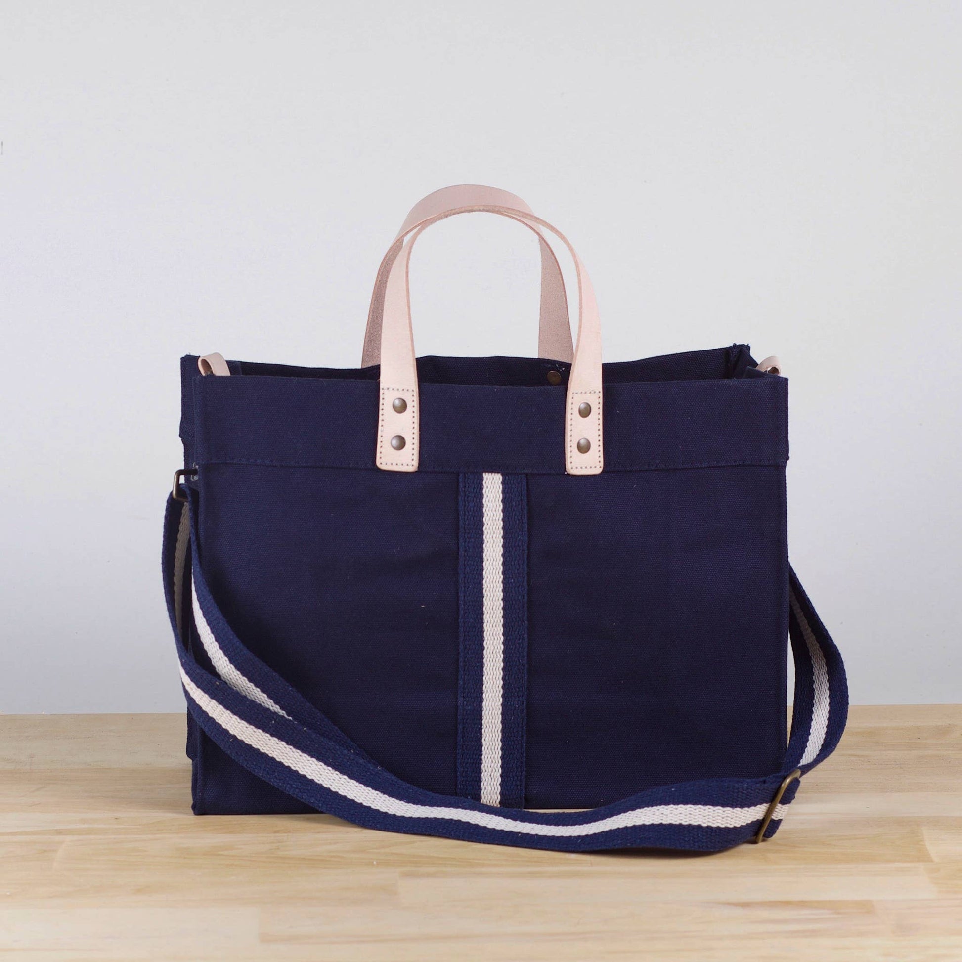 Crafted from sustainable, heavyweight cotton canvas 4 1/2” drop thick leather handles 48” canvas detachable shoulder strap Two interior slip pockets on the ends to keep smaller items organized Reinforced bottom for added sturdiness Now with a snap closure! Size 14.5" x 10" x 5"