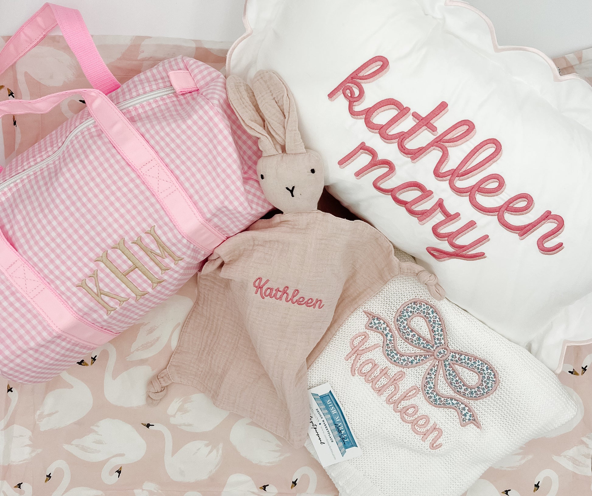 Price includes stitched personalization. Applique + $12. Please input name or initials exactly as you would like them to appear. Questions? Out of the style you'd love? We'd love to help! Send us a message on the contact page.