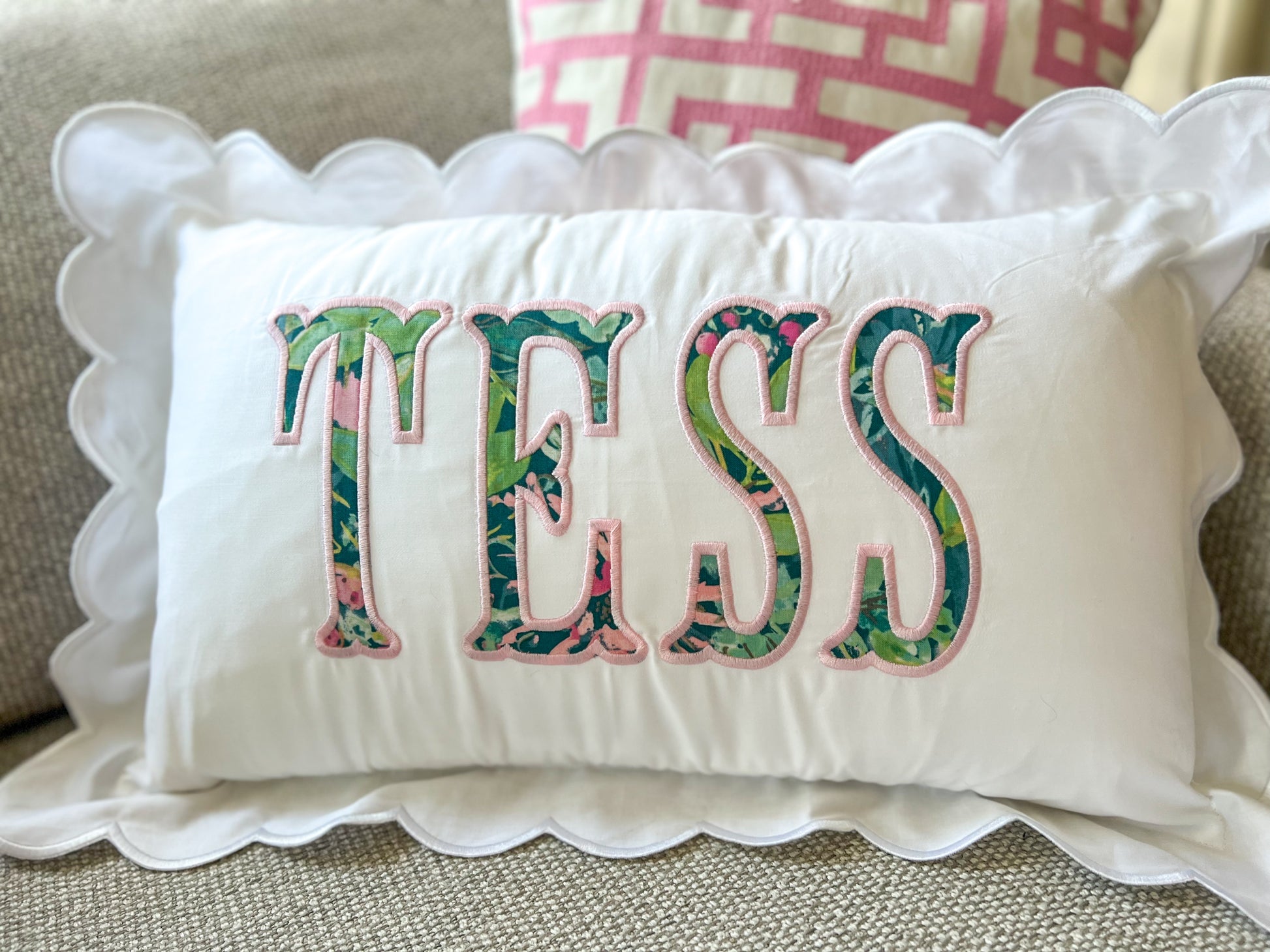The most gorgeous addition to any room- you'll love our Scalloped Edge Pillows! If interested in applique- the default fabric matches the trim. There are so many ways to customize and perfectly match your decor. Please reach out with custom requests!