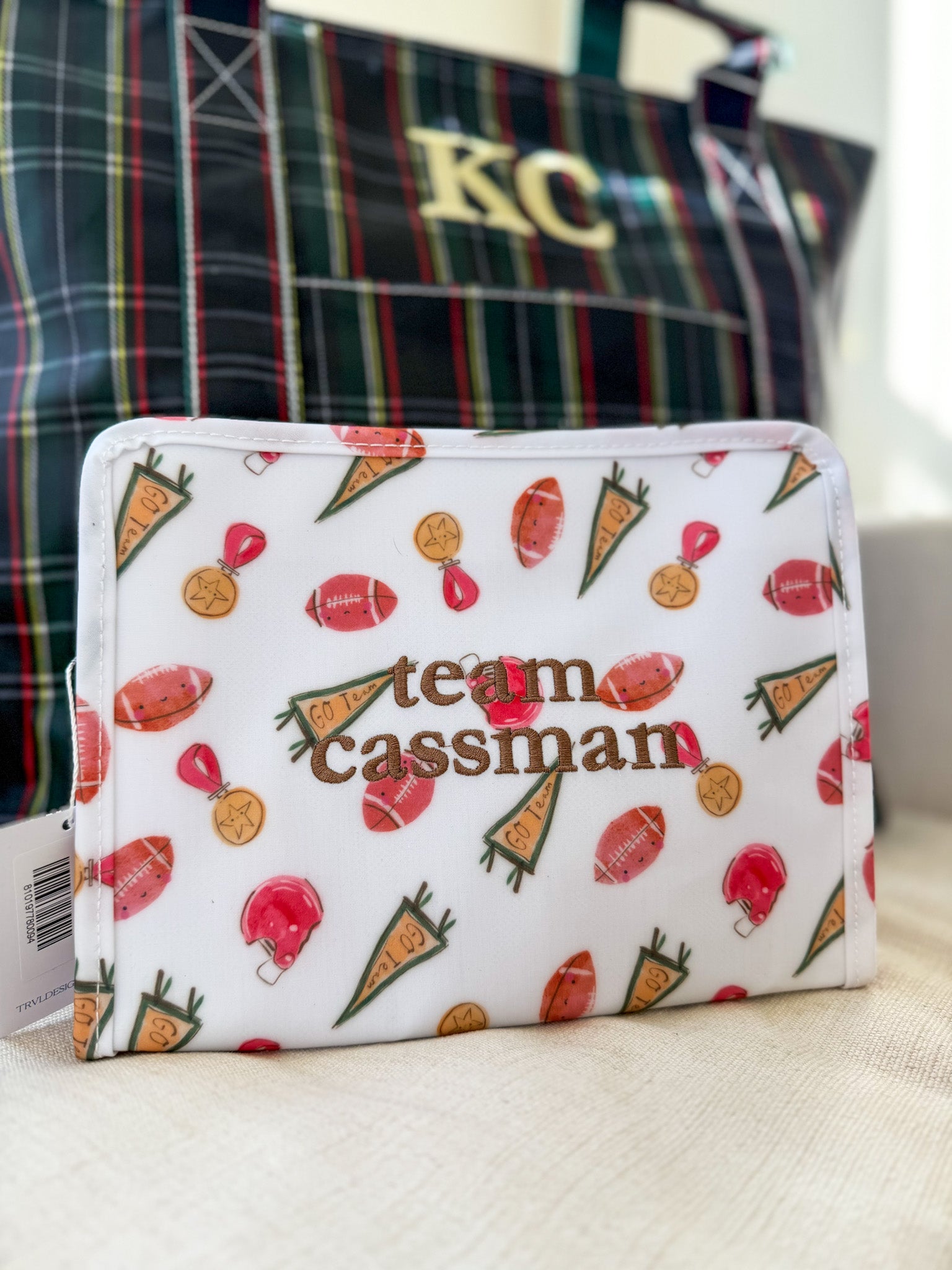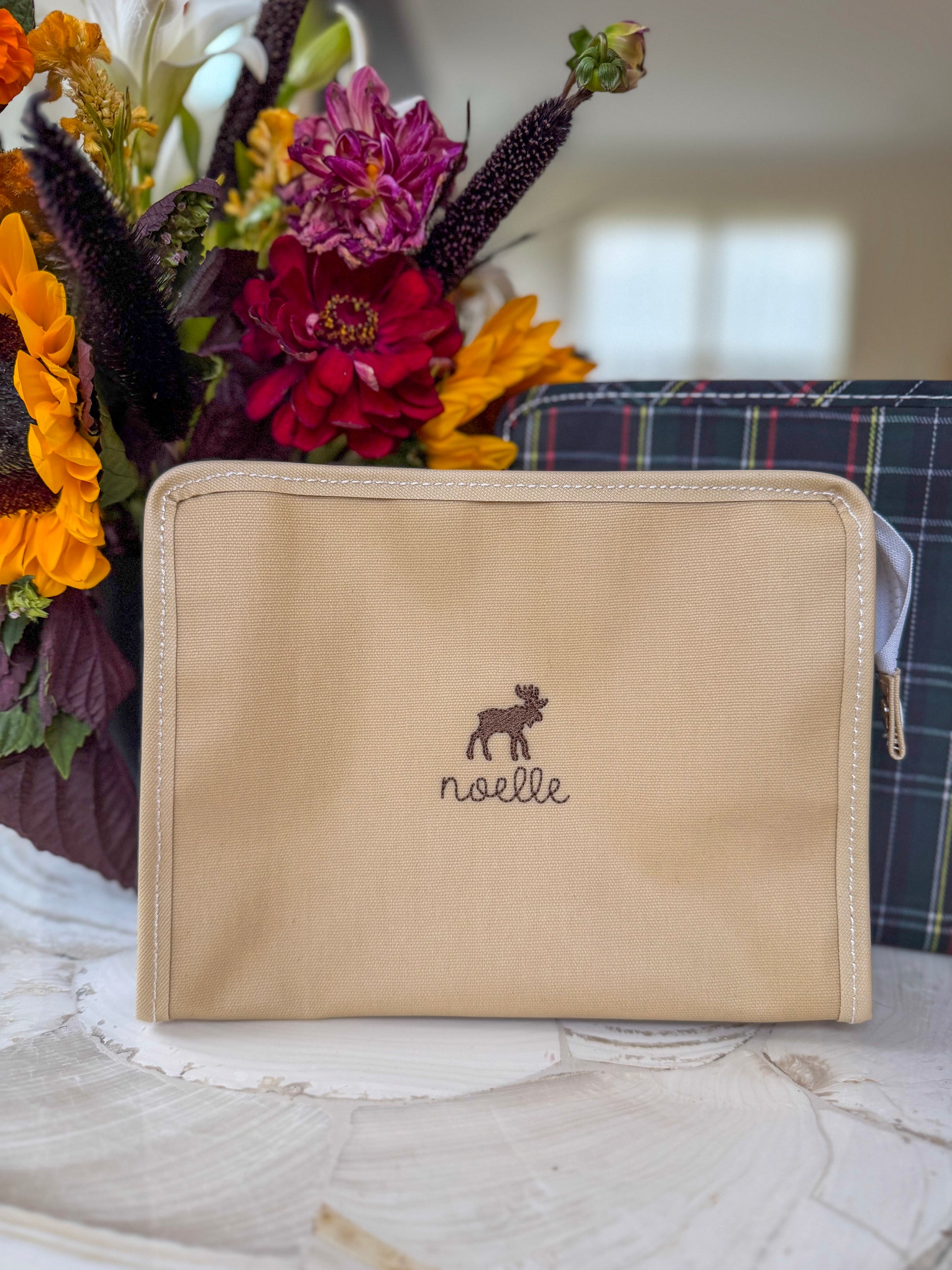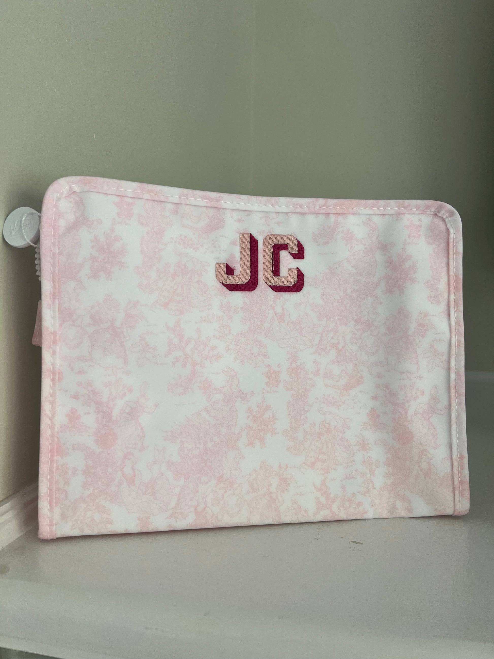Size: 10.5"l x 8.75"h x 3.5"d * Coated Cotton * Lined in poly twill * Chunky White Zipper with snap closure Water and stain resistant & wipeable inside and out