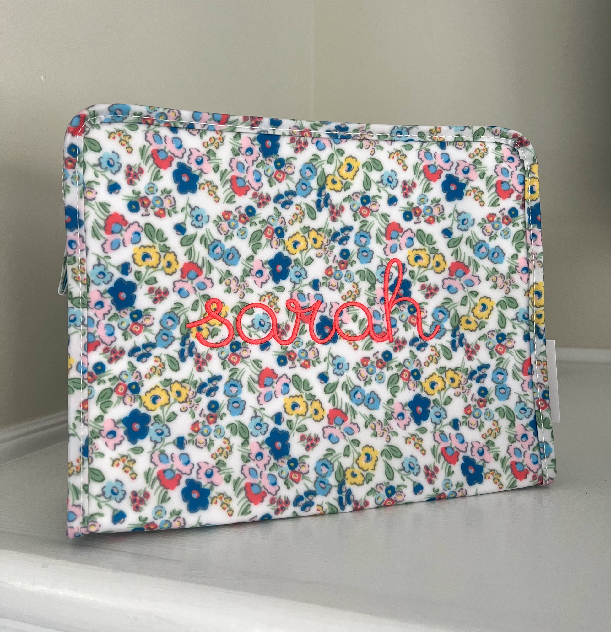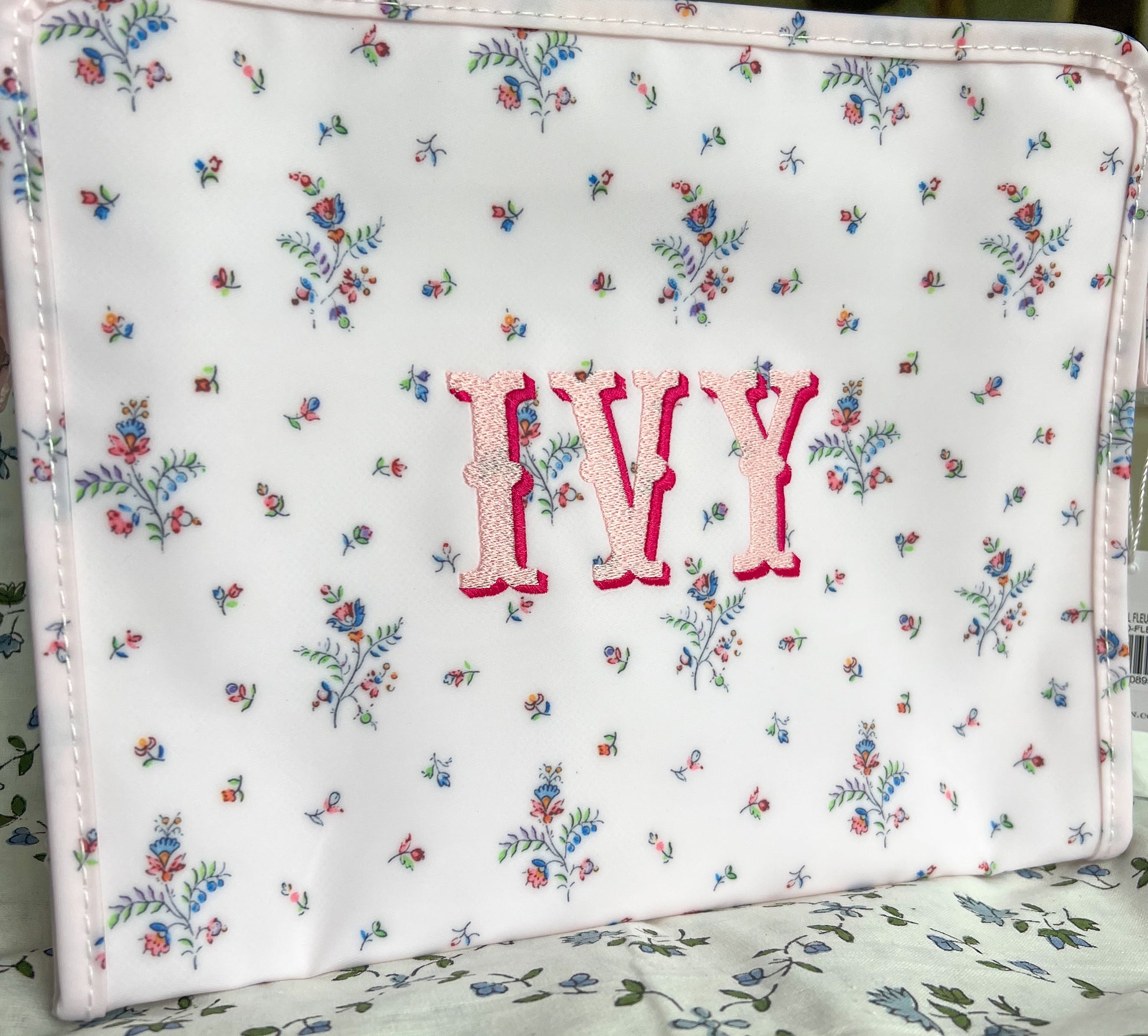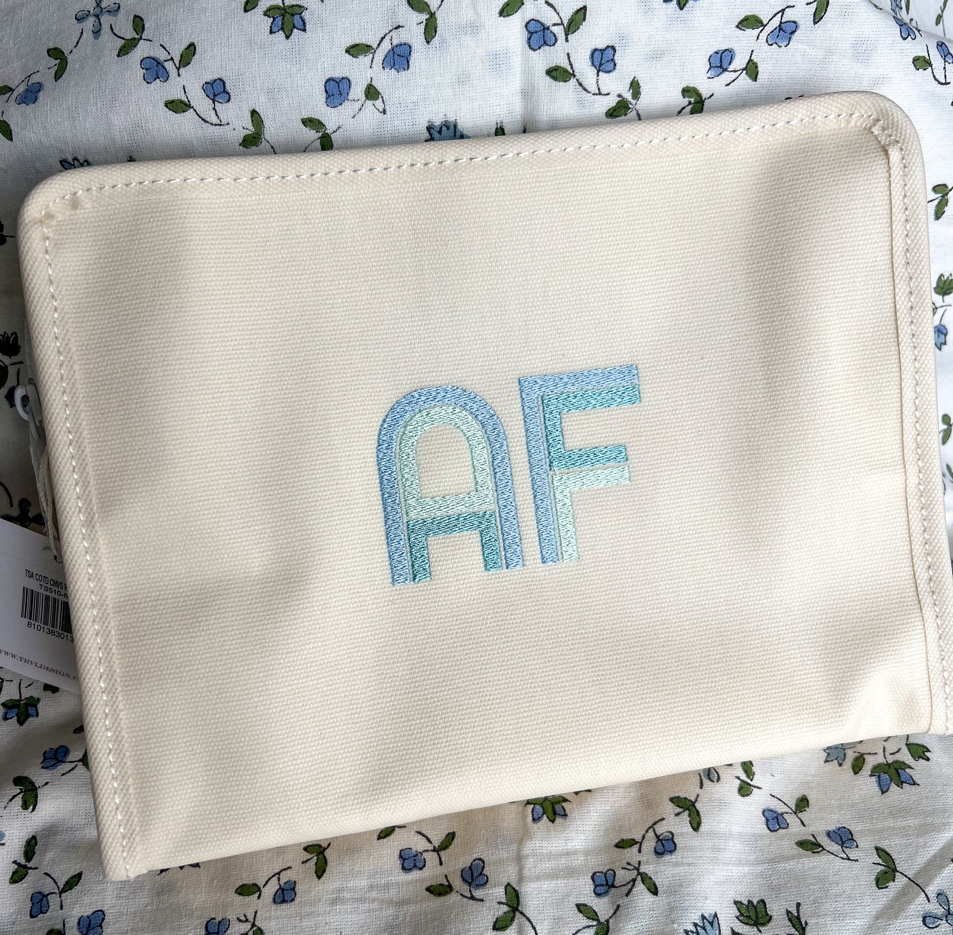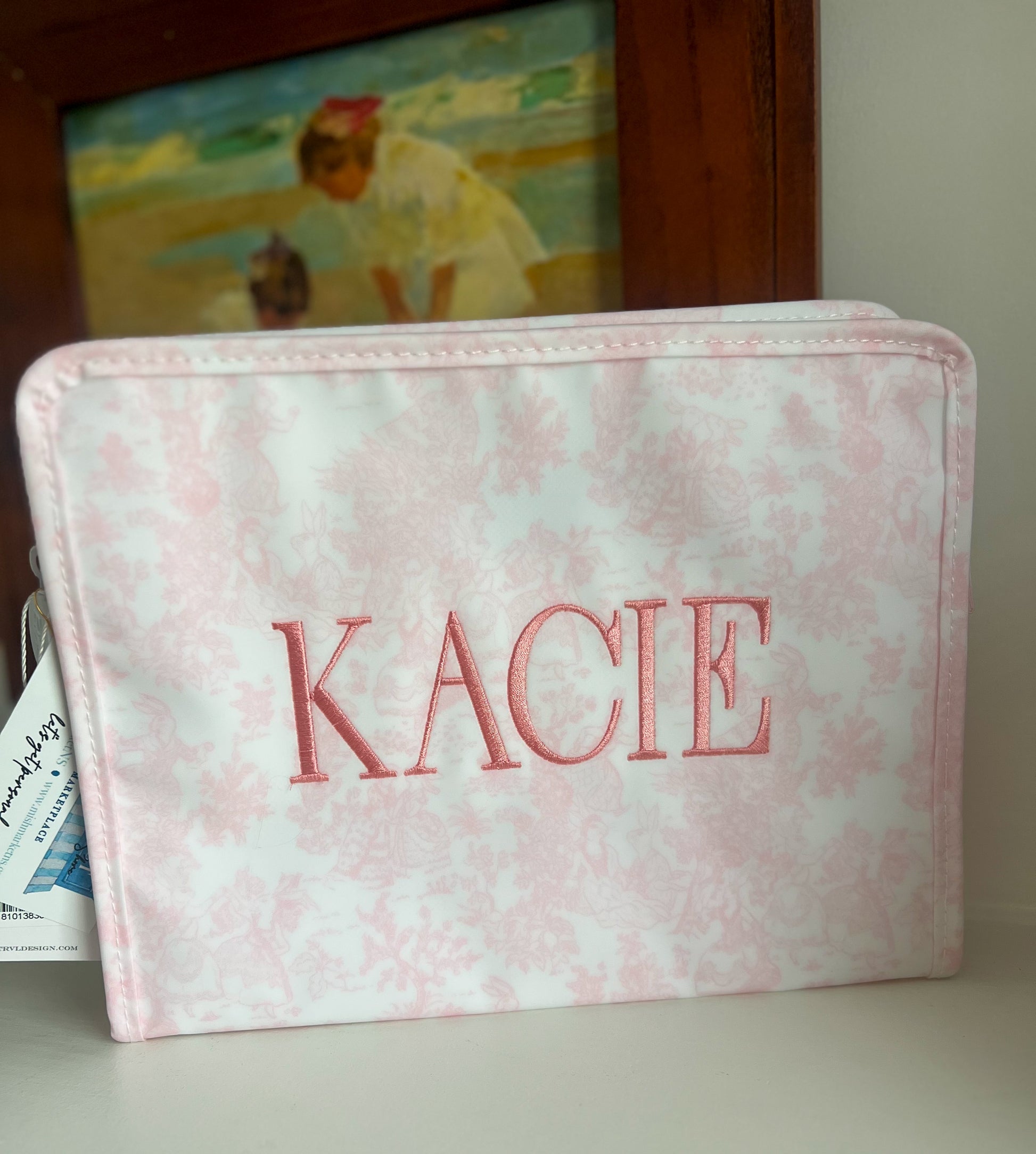 Size: 10.5"l x 8.75"h x 3.5"d * Coated Cotton * Lined in poly twill * Chunky White Zipper with snap closure Water and stain resistant & wipeable inside and out