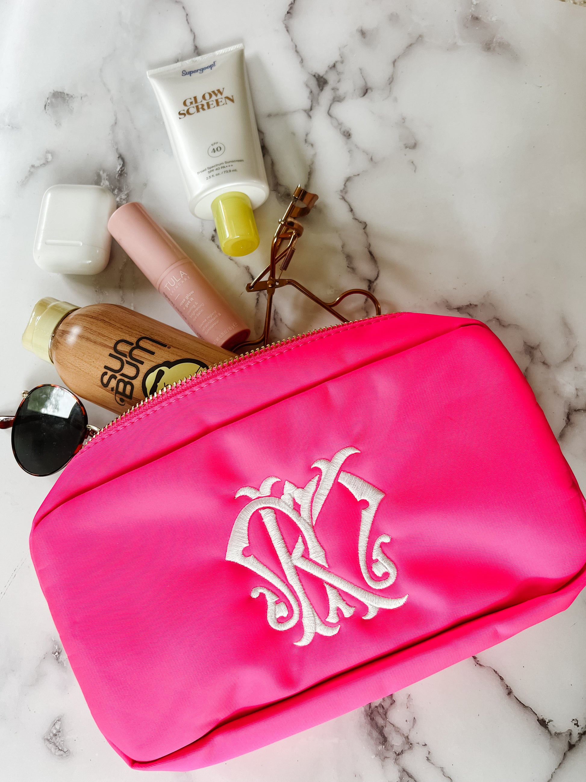 Our most beloved Travel Bag/ Toiletry holder/ Makeup Organizer available to be customized so many ways. Make it sophisticated with our interlocking two letter monogram or playful with our adorable rainbow font! Whether it's personalized with their name or camp name it's perfect for your Go-Away camper. This Nylon Zipper pouch is your on-the-go, go to!